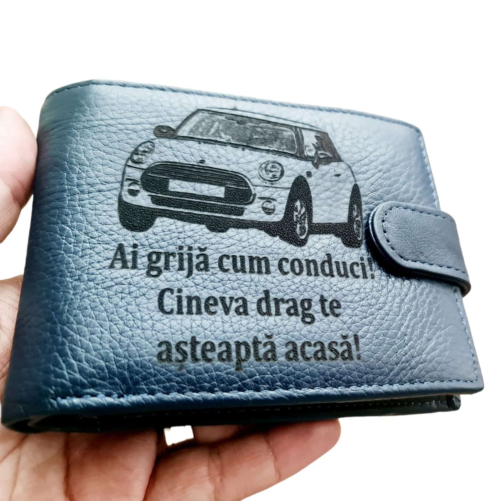 Portofel Personalizat ‘Ai grija cum conduci’, barbati, piele naturala,cu capsa, albastru, 12.5 x 10 x 2.8 cm