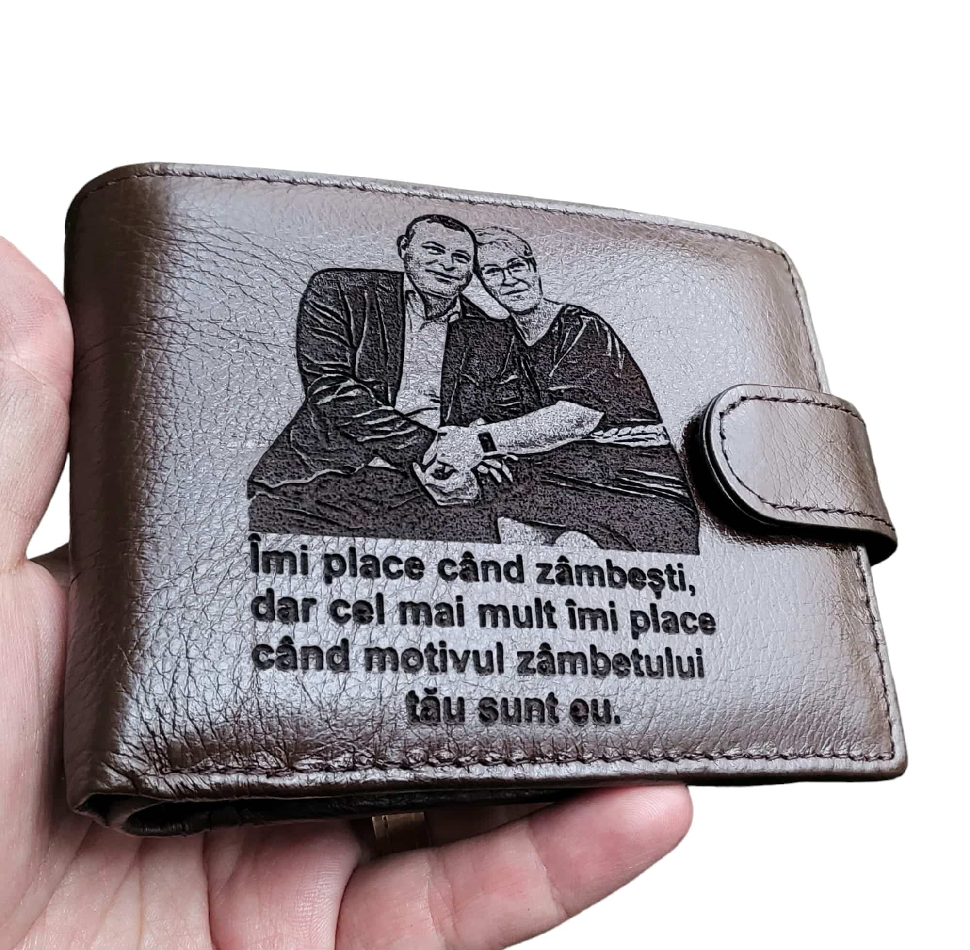 Portofel personalizat piele naturala maro Imi placa cand zambesti